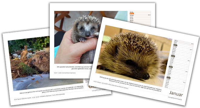 Für alle Igel- und Naturfreunde haben unsere Vereinsmitglieder auch dieses Jahr wieder einen Igelkalender entworfen – mit Fotos der uns anvertrauten stacheligen Patienten, von unseren Pflegeigeln bei der Auswilderung und ganz „natürlichen Schnappschüssen“.